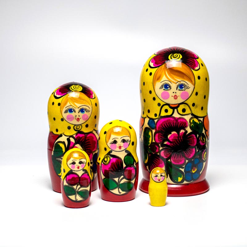 Presented Russian dolls are commonly called “Maidan Dolls”. The name has been taken from the make place, a vilage of Polkov-Maidan. The main element of the Maidan endemic doll is a multi-petal rosehip flower, surrounded by several half-opened buds. Painting a doll begins with drawing the contour with ink, then the product is primed with durable water-based potato starch coating, after painting, each matryoshka is covered with transparent varnish of the same background two or three times.