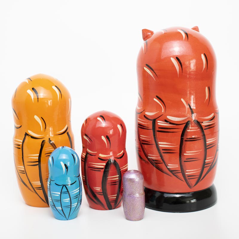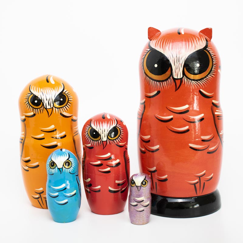 Genuine handmade set of 5 matryoshka nesting dolls depicting owls.