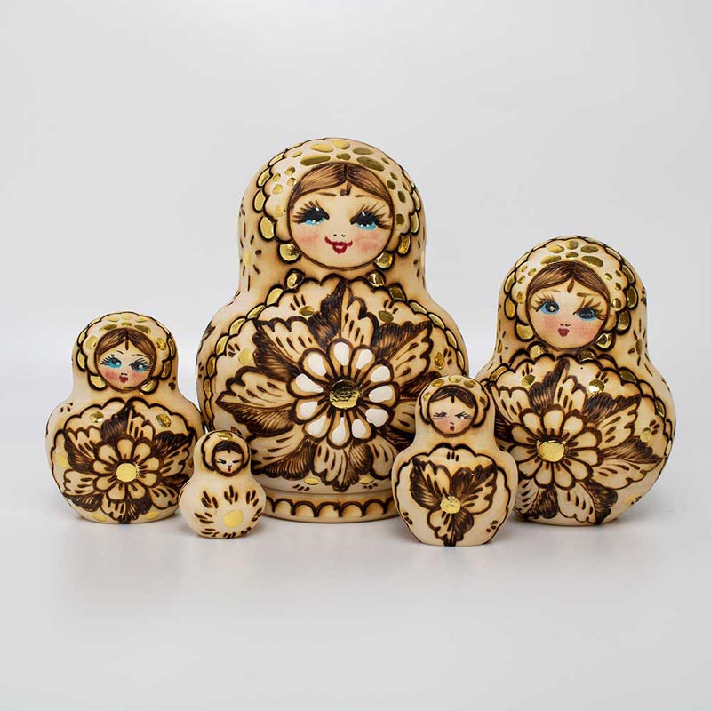 These gloss-finished lovely matryoshkas features with unique pyrographic vintage design.
