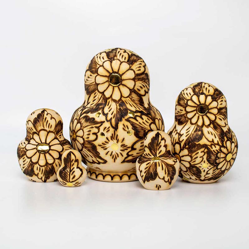 Glowing with shimmering gold, this floral design wood-burned nesting dolls are just simply stunning.